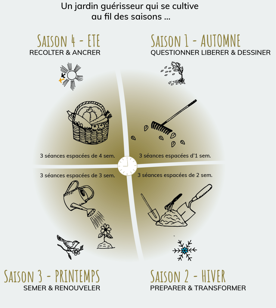 La réflexologie plantaire ayurvédique s’ancre dans un processus et fonctionne par « saison » de 3 séances, espacées de 1 (1ère saison) à 4 semaines (dernière saison), au fil de la progression. Comme un jardin que l’on cultive au fil des saisons…