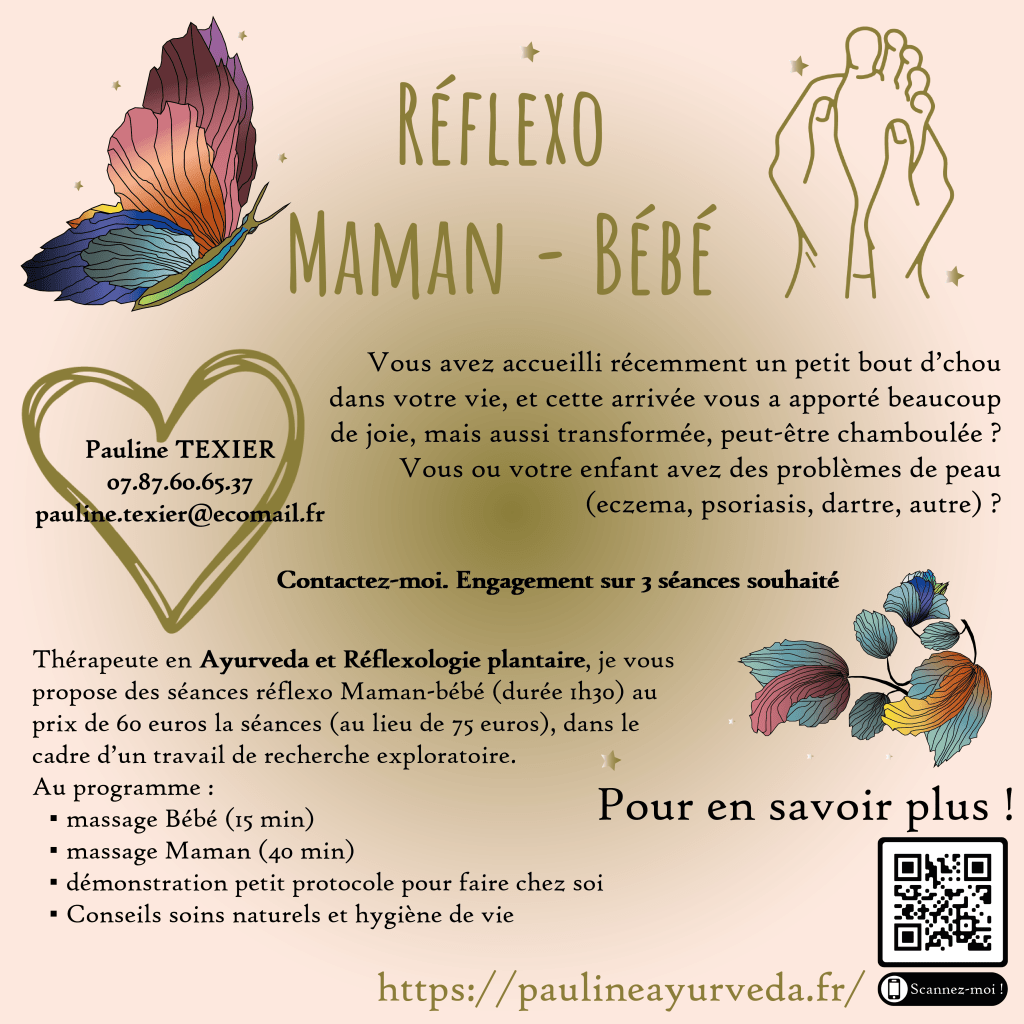 Dans le cadre d’un mémoire de recherche exploratoire en Réflexologie plantaire ayurvédique (ERPA), je recherche des couples « maman-bébé » qui expérimentent actuellement des problèmes de peau : venez découvrir ces séances à prix réduit !*
